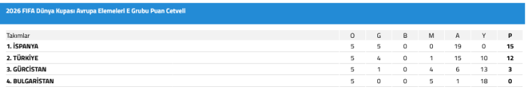 Ay-Yıldızlılar 12 puanla ikinci sırada bulunurken, 15 puandaki İspanya lider durumda.